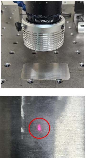 Place a reflective piece or mirror under the Final Focus Lens. You will be able to observe a red dot, the IAM BEAM. Confirm with the technical service if the AIM BEAM turns on.