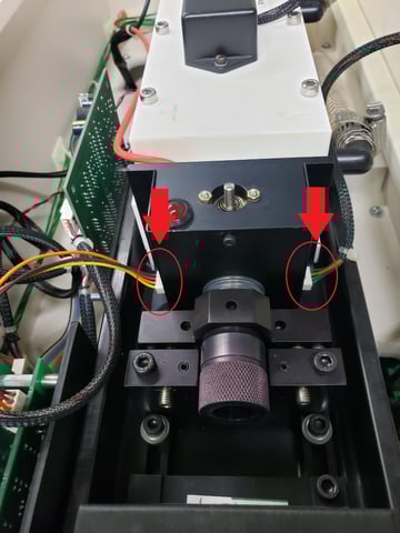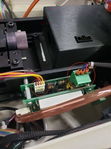 4. On the Safety Shutter PCB, check that the cables are properly connected. With the laser off, try pulling on the red, blue, and black cables. If they are loose, tighten them with a flathead screwdriver. Also, check that the connection block is properly inserted into the PCB.