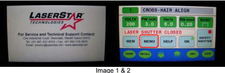 - Turn the welder on via the main and key switches. Requirement: the laser system will go through its software initialization process, display the support screen, and then proceed to the main screen on the touch screen display. See images 1 & 2 for reference.