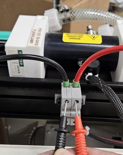 - Place the Red probe of the meter to the red wire side of the flash lamp and the black probe to the black wire side of the lamp