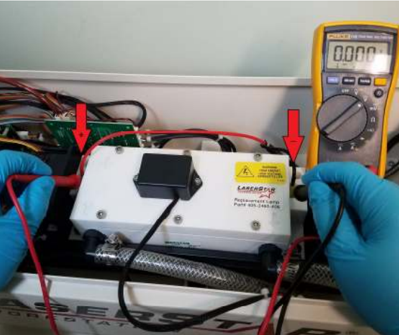 - Set the voltmeter to 1000VDC and place the leads in the plug on the side of the Quick Connector that goes to the Simmer Supply (black and white wires)